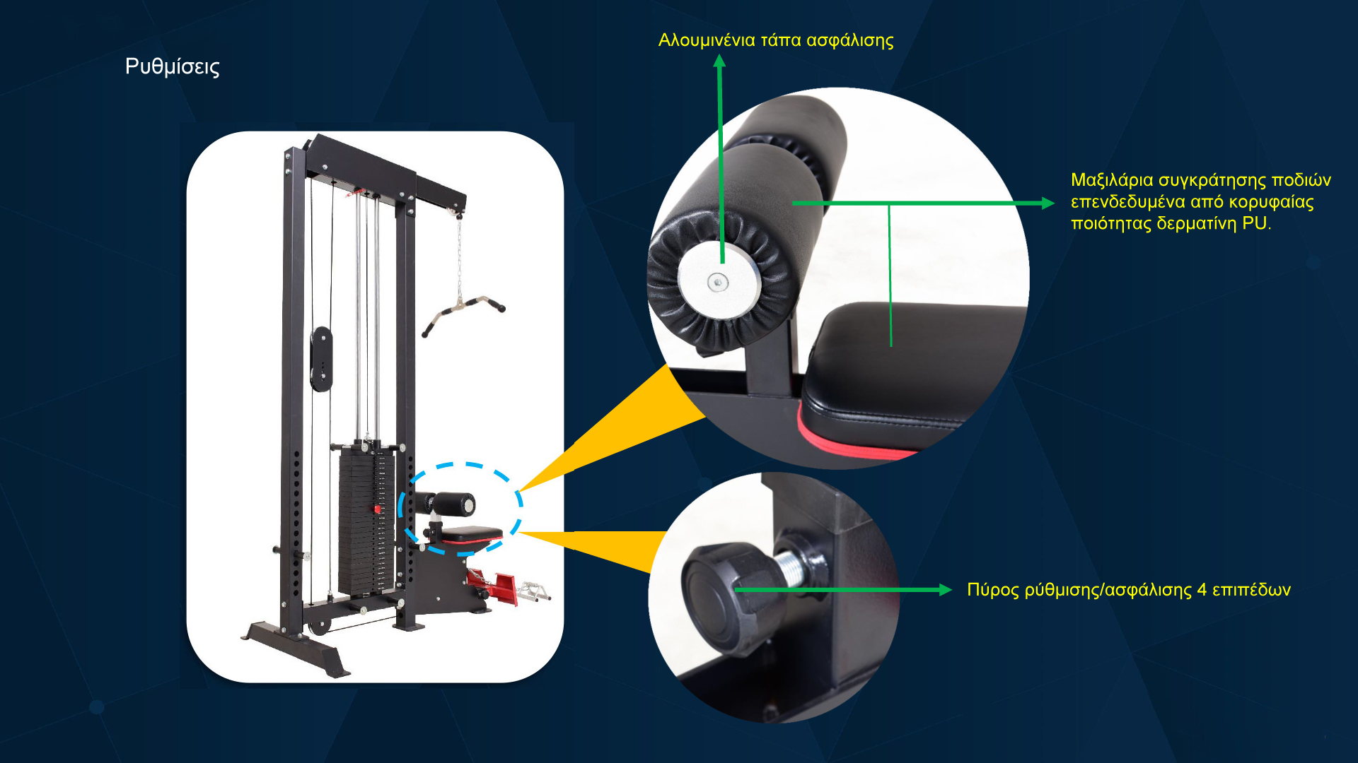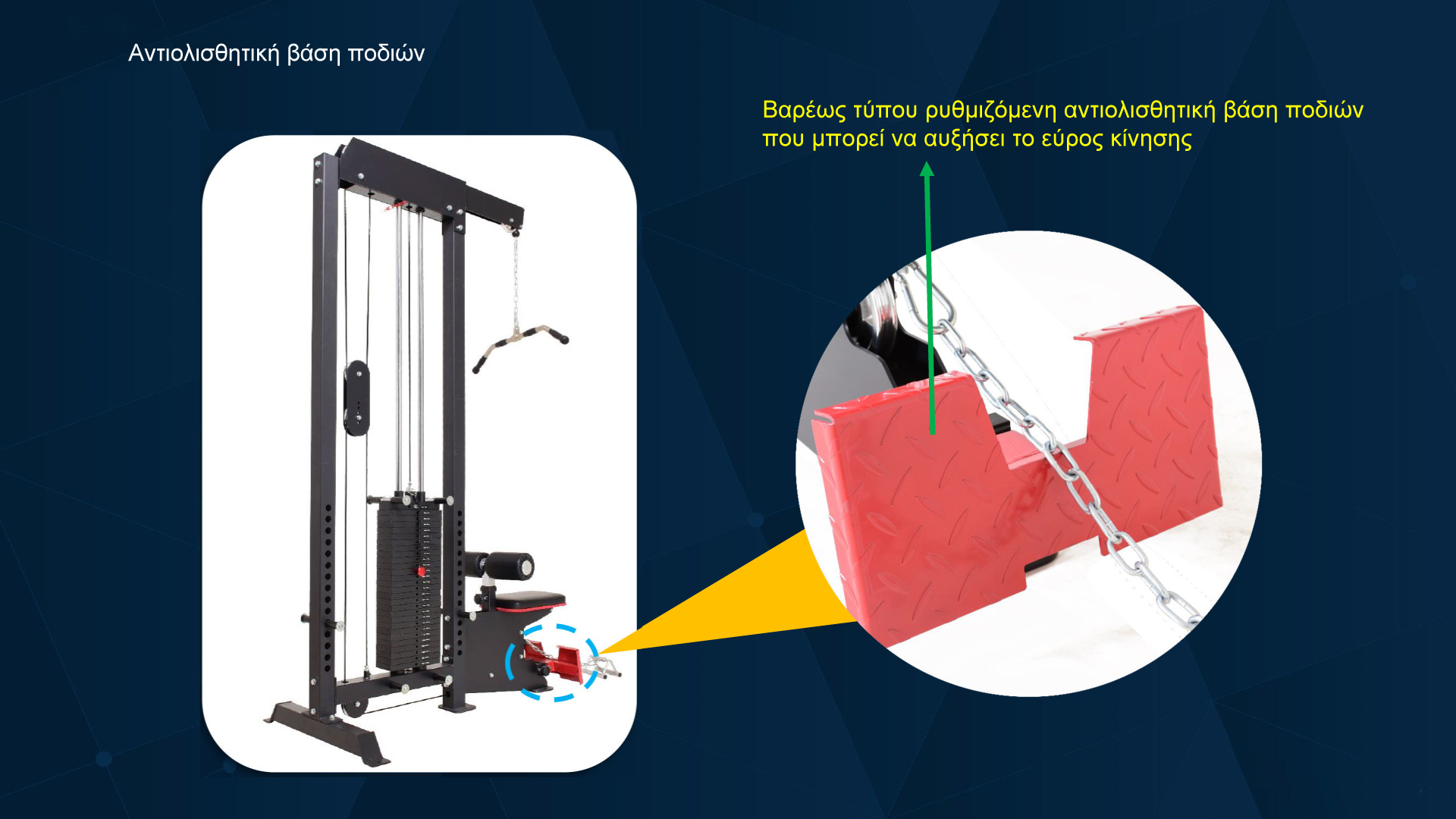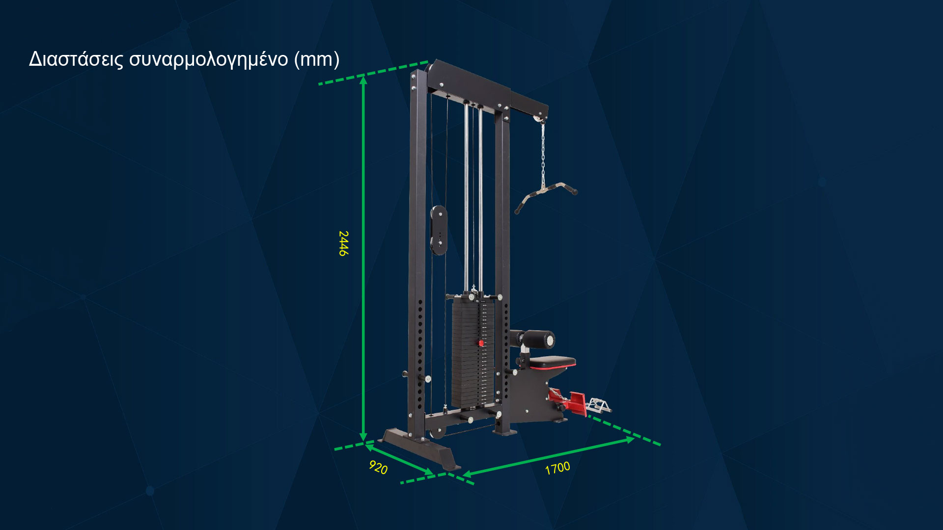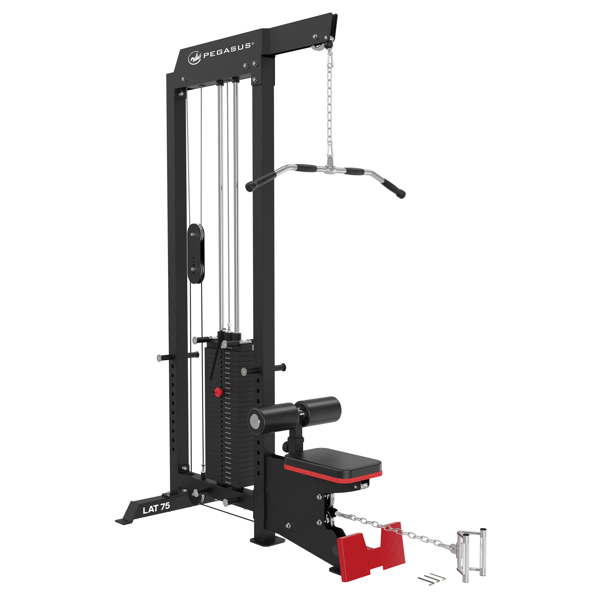Το βαρέως τύπου Lat-75 με στοίβα βάρους 140kg, είναι ένα ευέλικτο, συμπαγές μηχάνημα. Κατασκευασμένο με στιβαρό ατσάλινο πλαίσιο, συνδυάζει τις έλξεις πλάτης και χαμηλή κωπηλατική σε μία μονάδα, για να στοχεύει την πλάτη, τους ώμους και τα χέρια, με ομαλή, σταθερή αντίσταση.